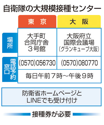東京と大阪に設置した 新型コロナウイルス ワクチン の「自衛隊大規模接種センター」について、政府は64歳以下の人も接種対象に加える方針を固めた。 15日にも発表する。 自衛隊大規模接種センター. 自衛隊大規模接種センターでの接種や職域接種などを希望する人へ 64歳以下の人にクーポン券(接種券)を送付しました 12歳から64歳の人へのクーポン券は下記の通り発送しました。 対象年齢 (令和4年3月31日の年齢。12歳のみ満.
